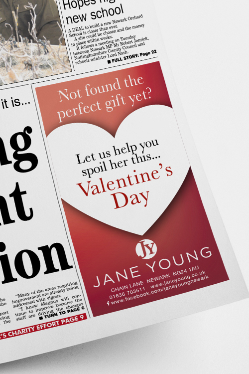 Front page valentine advert for Jane Young.